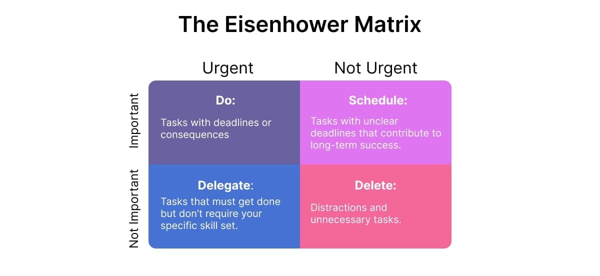 Start your day by pinpointing your top priority tasks. Use the Eisenhower Matrix, which divides tasks into four categories: urgent and important, not urgent but important, urgent but not important, and neither urgent nor important. Concentrate on tasks that fall into the “urgent and important” category and delegate or remove those in the other categories.